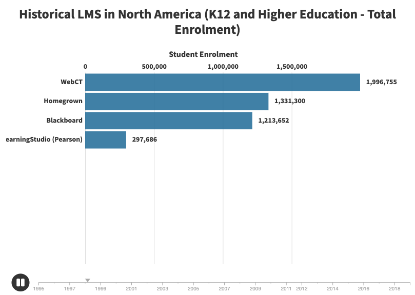 In the last few months, the LMS world has seen the potential sale of Instructure and the sale of Schoology. To explore the history of the LMS world, we decided to build a Bar Chart Race to show the evolution of the market share for the past 20+ years.